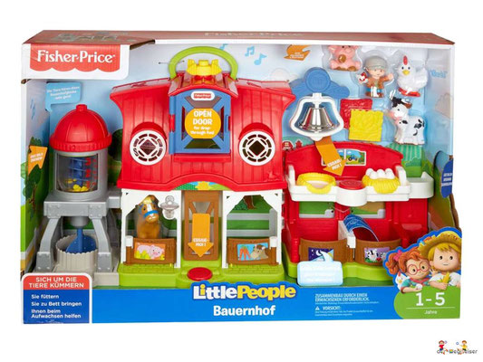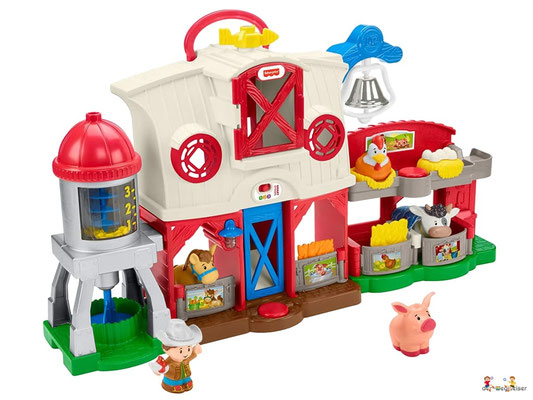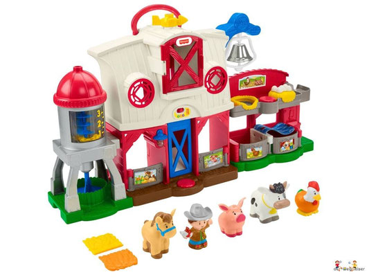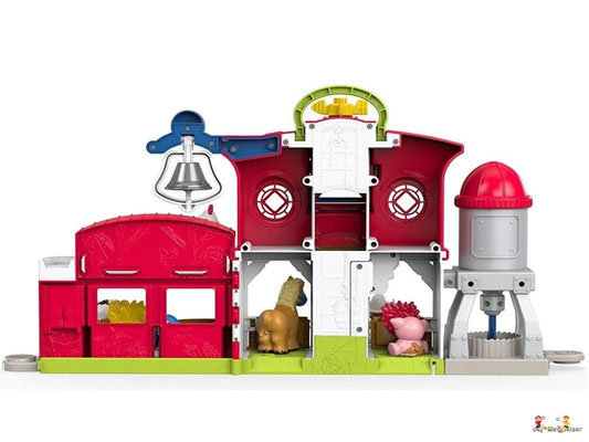 Bauer Jed kümmert sich fleissig um all seine Tiere auf dem Bauernhof, und das Kind kann ihm helfen. Dabei lernt es, wie man Hühner füttert, einem Pferd eine weiche Decke auflegt und tolle Sachen bewirkt. Der Spass beginnt, wenn der Entdeckspassknopf gedrückt wird, damit die Stalltüren aufgehen und lustige Lieder und Sätze zu hören sind. Lässt das Kind Gegenstände durch die Öffnung im Heuboden fallen, werden weitere Geräusche und Sätze aktiviert. Ausserdem kann das Kind Küken „schlüpfen“ lassen, indem es den Entdeckspassknopf drückt, das Silo drehen, damit der Mais herumwirbelt, und vieles mehr. Läutet es die Glocke, wissen die Tiere, dass es etwas zu fressen gibt, und die Hühner werden mit Mais gefüttert. Dieses Spielset ist mehr als nur ein Bauernhof, es ist das Zuhause der neuen Freunde des Kindes.