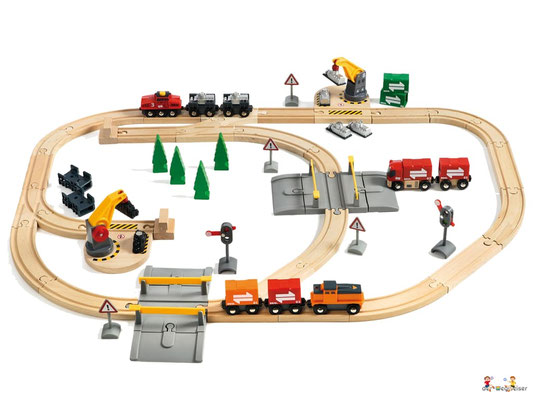 Das Set ist ein grosses und umfangreiches Holzeisenbahnset, das Kindern viel Spielspass bietet. Es ist auch eine tolle Möglichkeit, Kreativität und Fantasie zu fördern.