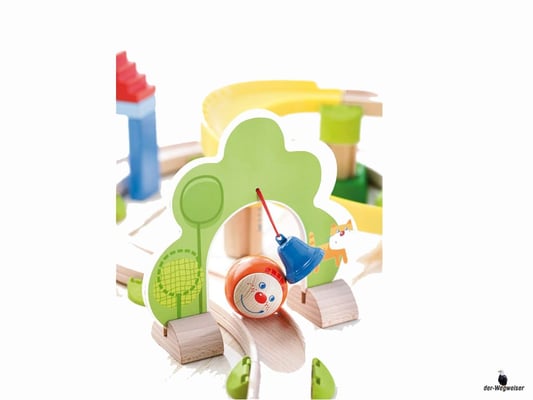 Mit einem fröhlichen „Klingeling“ läutet das Glöckchen das Ende der munteren Fahrt ein. Wer weiterspielen möchte, kann die Kringelbahn beliebig mit jeder anderen Kullerbü-Kugelbahn ergänzen.