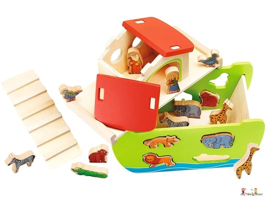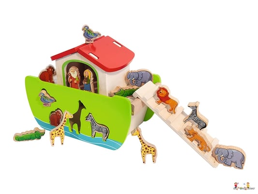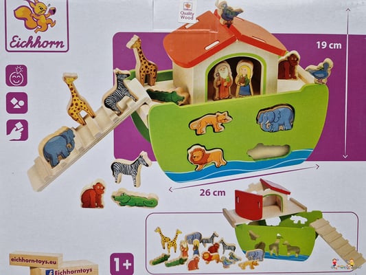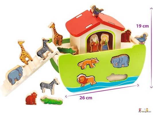 Das Eichhorn Steckspiel "Arche Noah" bietet Kindern tolle Spielmöglichkeiten. Über die Treppe gelangen alle Tiere auf das Schiff. Dort können sie sich an Deck oder unter dem Häuschen verstecken. Zum besseren bespielen kann das Dach des Häuschens abgenommen werden.