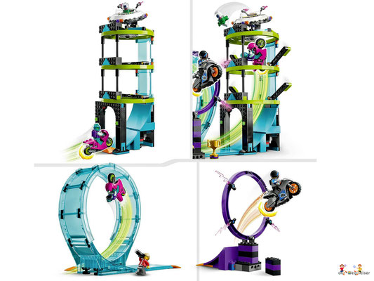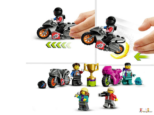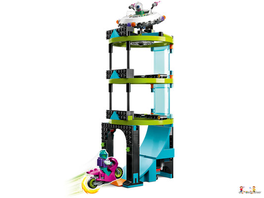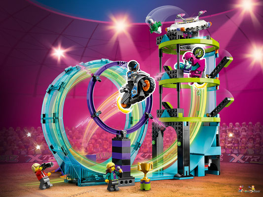 Dieses 7+ Set beinhaltet eine Dreifachfunktion, 2 Stuntbikes sowie eine Konstruktion, um Looping, Feuerreifen und Alien-Turm zu einer Challenge zu kombinieren. Kinder können ihr Können auf die Probe stellen, eine spektakuläre Stuntshow zeigen oder sich mit Freunden und Geschwistern Wettkämpfe um den Siegerpokal liefern.
