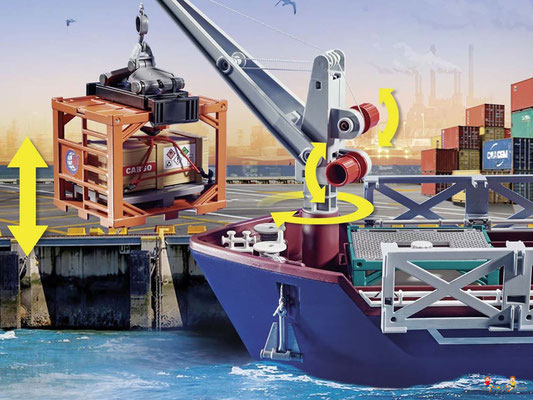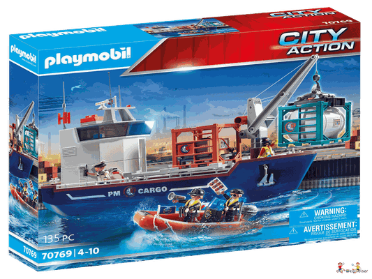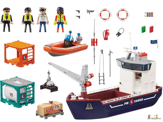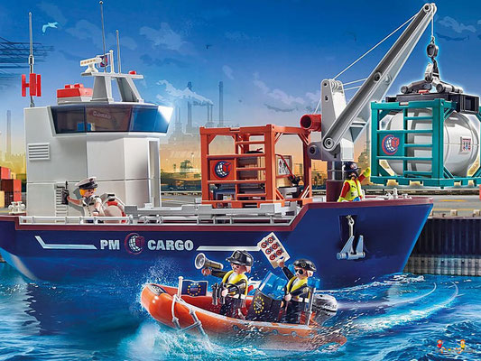 Das Spielset enthält vier PLAYMOBIL-Figuren, ein Containerschiff mit Verladekran, ein Zollboot mit Aussenbordmotor, Container, Fernglas, Megaphon und viele weitere raffinierte Extras. Das Frachtschiff schwimmt und kann mit einem Unterwassermotor (7350) aufgerüstet werden.