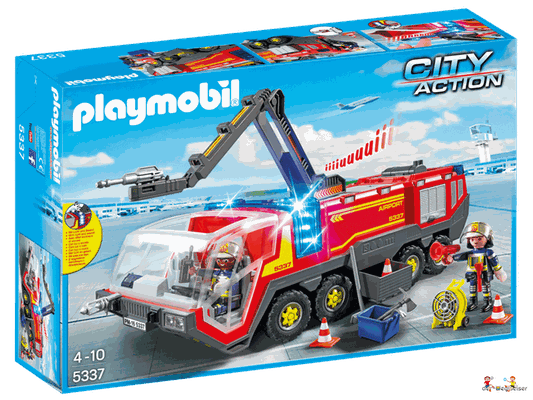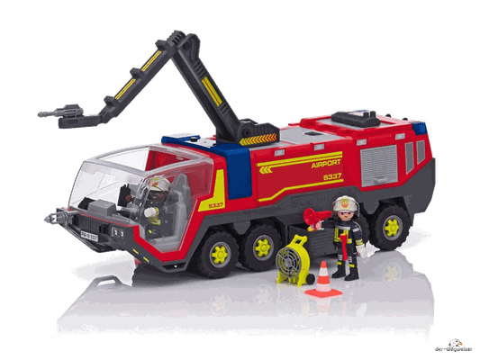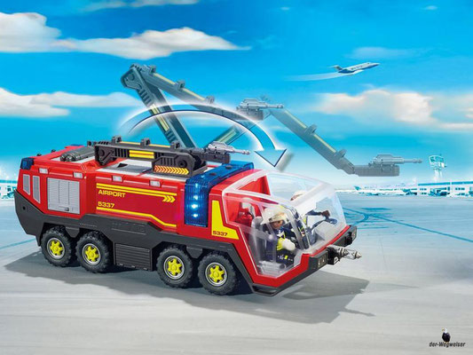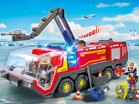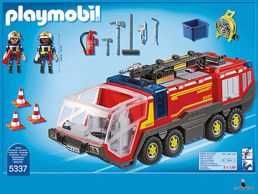 Das Playmobil City Action Feuerwehr Flughafenlöschfahrzeug 5337 mit Licht und Sound ist das modernste Löschfahrzeug der Welt. Die Flughafenfeuerwehr bekämpften mit dem Koloss Brände und rasen mit Höchstgeschwindigkeit über die Landebahn. Die Aufgaben des Flughafenlöschfahrzeuges sind, schnelle und massive Brandbekämpfung auf einem Flughafenareal, oder auch in unwegsamem Gelände. Die Fahrzeuge sind speziell für den Einsatz auf nicht öffentlichen Grundstücken konzipiert und haben normalerweise mehr als 40 Tonnen. Aber keine Angst, das PLAYMOBIL Flughafenlöschfahrzeug wurde speziell für Kinder gemacht und lässt sich leicht bewegen. Sei aber wachsam, auf einem Grossflughafen, müssen die Löschfahrzeuge jeden Punkt des Areals innerhalb von drei Minuten erreichen können! Und wenn das Fahrzeug nicht im Einsatz ist, wartet es im Hanger 4, der du dir leicht mit einer Kartonkiste erstellen kannst! Viel Spass!