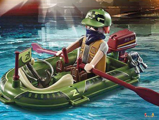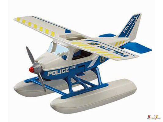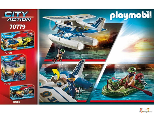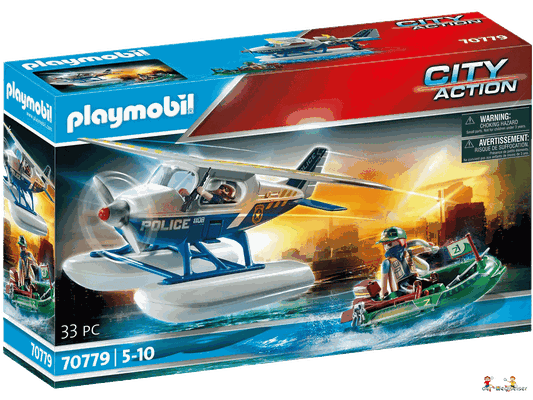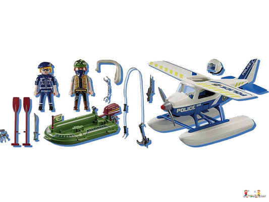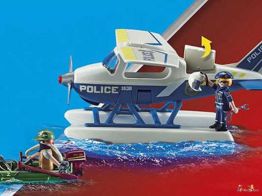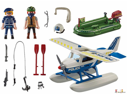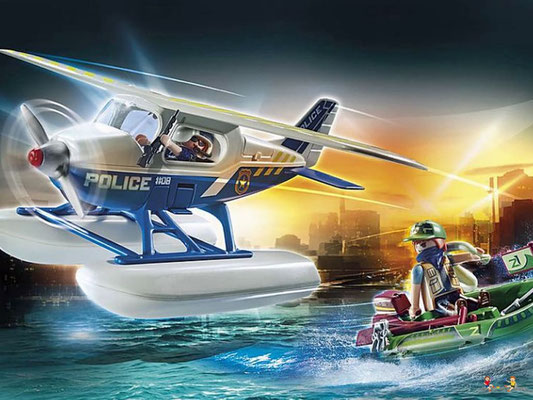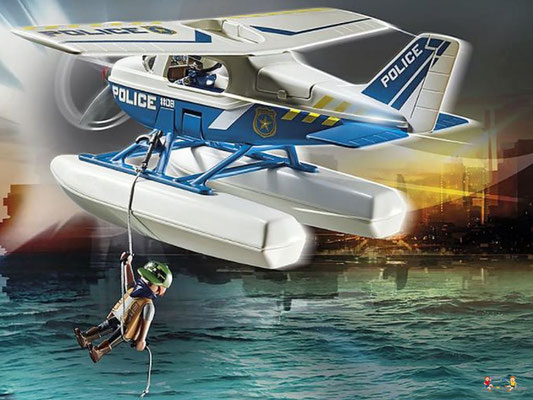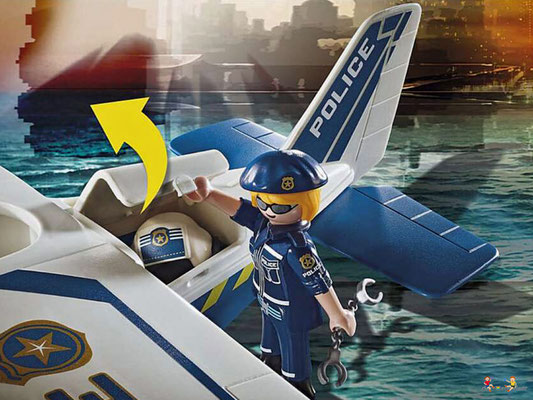 In der Luft sorgt die mutige Playmobil Polizei für Recht und Ordnung. Ein Gauner ist mit seiner Schmugglerware auf der Flucht. Der Dieb versucht mit dem Schlauchboot zu fliehen. Doch die clevere Pilotin hat ihn aus dem Cockpit ihres Flugzeugs jederzeit im Blick und lässt ihn nicht entkommen. Gekonnt landet sie ihr Wasserflugzeug auf dem See und lässt ihm keinen Ausweg. Jetzt werden dem Flüchtigen Handschellen angelegt und es geht ab ins Flugzeug und zur Polizeistation.
