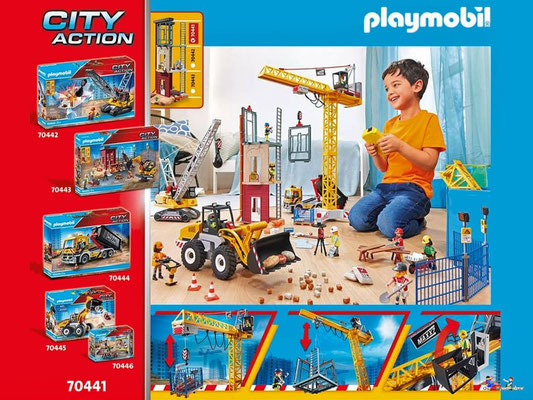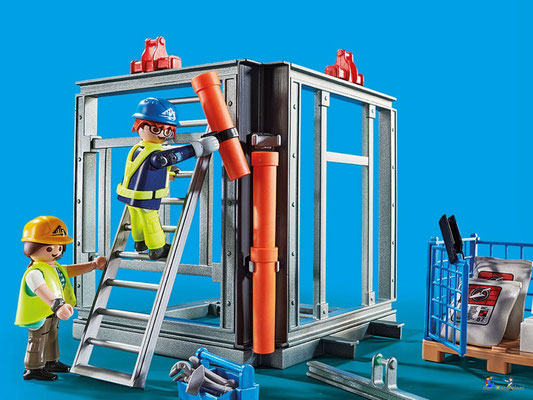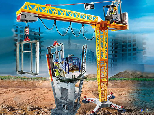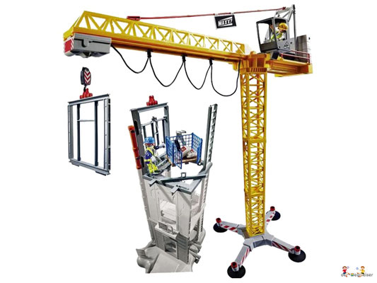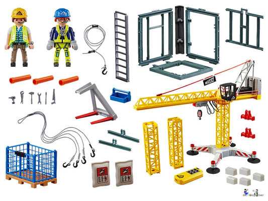 Es Sselten ist viel los auf der PLAYMOBIL Baustelle. Von früh bis spät sind die fleissigen Bauarbeiter eifrig am Werk, denn das neue Haus soll schnell fertig werden. Heute werden die Stahlträger verbaut. Vorsichtig hebt der Kranführer den schweren Stahlträger mit dem Kran an und transportiert ihn vorsichtig in Richtung der Bodenplatte, dann langsam absenken und in der Fassung verankern. Der erste Schritt ist getan, doch es folgen noch viele weitere bis der Feierabend kommt. Das Spielset besteht aus zwei PLAYMOBIL-Bauarbeiterfiguren, einem Kran, einer Gitterpalette, Steinen, Stahlträgern, einer Bodenplatte, Kletterhaken und viel weiterem Bauzubehör. Der Kran ist RC-fähig und kann mit dem enthaltenen IR-Handsender gesteuert werden. Durch die Kanalwechselfunktion des Handsenders können bis zu vier Kräne gleichzeitig gesteuert werden.