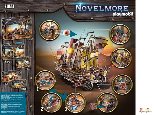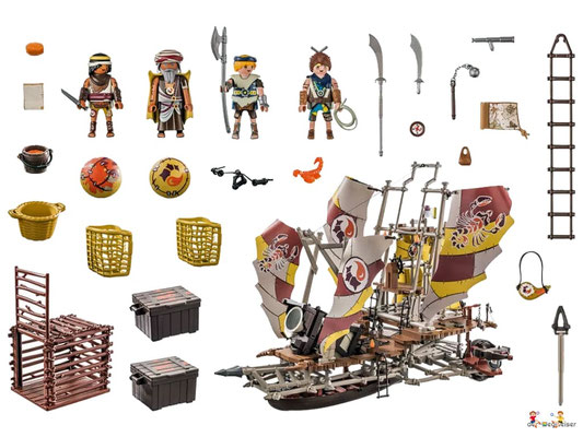 sich neben Arwynn und Gwynn zwei Ahari-Kämpfer, eine Blasebalgkanone, Giftpfeile und viele weitere spannende Extras für aufregende Wüstenabenteuer. Das Schiff lässt sich mithilfe der Räder über