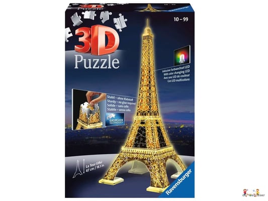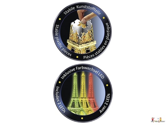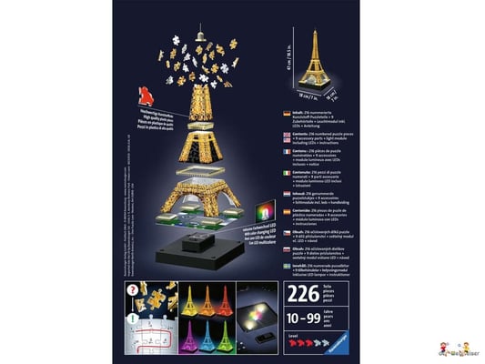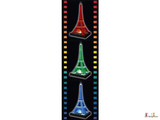 Der Eiffelturm ist das markante Wahrzeichen der Stadt Paris. Die Stahlkonstruktion wurde für die Weltausstellung 1889 errichtet und ist seitdem von zahllosen Touristen erklommen worden. Betrachte das Gebäude aus einem ganz neuen Winkel, wenn du es Stück für Stück zusammensetzt! Es wurde nicht nur liebevoll und detailliert im goldgelben Nacht-Design gestaltet, sondern wird mittels LEDs von innen erleuchtet. Dabei haben Sie die Wahl zwischen zwei Funktionen: Die sanfte originalgetreue Beleuchtung mit weissen LEDs oder die anregende Farbvariante mit wechselnden Farbtönen.
