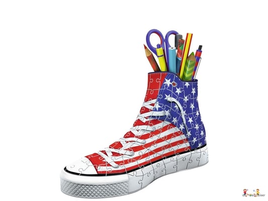 Ein Sneaker zum Selberpuzzeln. Sneaker sind angesagt! Und das nicht nur als trendiger Schuh für jeden Zweck, sondern auch in Form des Ravensburger 3D Puzzles „Sneaker American Style“ als cooles Accessoire für das Kinderzimmer. Wer eine praktische Aufbewahrungsmöglichkeit für die vielen Gegenstände sucht, die kreuz und quer auf dem Schreibtisch eines Kinderzimmers herumliegen, für den ist dieser 3D Puzzle-Sneaker genau das Richtige. Lässiges Design, coole Farben und angesagter Look. Der Sneaker ist perfekt für coole Kids. Zuvor ist allerdings Puzzeln angesagt, denn die 108 Kunststoffteile wollen zusammengesetzt werden. Durch die Easyclick Technology passen die Teile ganz ohne Klebstoff präzise und stabil ineinander. Gepuzzelt werden kann nach Motiv oder nach Zahlen. Das Ravensburger 3D Puzzle „Sneaker American Style“ ist ein Muss für alle, die auf der Suche nach einem wirklich besonderen Accessoire sind. Der Sneaker ist ein echter Hingucker. Doch es kommt noch besser, denn dank des praktischen Inlays dient der neue Sneaker auch als „Wunderschuh“. So finden dort kleine Geheimnisse genauso ihren Platz wie Stifte, Füller, Lineale und natürlich all die Dinge, die viel lieber herumstehen als herumliegen!