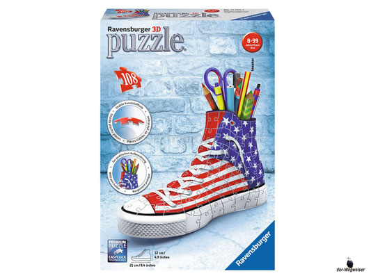 Ein Sneaker zum Selberpuzzeln. Sneaker sind angesagt! Und das nicht nur als trendiger Schuh für jeden Zweck, sondern auch in Form des Ravensburger 3D Puzzles „Sneaker American Style“ als cooles Accessoire für das Kinderzimmer. Wer eine praktische Aufbewahrungsmöglichkeit für die vielen Gegenstände sucht, die kreuz und quer auf dem Schreibtisch eines Kinderzimmers herumliegen, für den ist dieser 3D Puzzle-Sneaker genau das Richtige. Lässiges Design, coole Farben und angesagter Look. Der Sneaker ist perfekt für coole Kids. Zuvor ist allerdings Puzzeln angesagt, denn die 108 Kunststoffteile wollen zusammengesetzt werden. Durch die Easyclick Technology passen die Teile ganz ohne Klebstoff präzise und stabil ineinander. Gepuzzelt werden kann nach Motiv oder nach Zahlen. Das Ravensburger 3D Puzzle „Sneaker American Style“ ist ein Muss für alle, die auf der Suche nach einem wirklich besonderen Accessoire sind. Der Sneaker ist ein echter Hingucker. Doch es kommt noch besser, denn dank des praktischen Inlays dient der neue Sneaker auch als „Wunderschuh“. So finden dort kleine Geheimnisse genauso ihren Platz wie Stifte, Füller, Lineale und natürlich all die Dinge, die viel lieber herumstehen als herumliegen!
