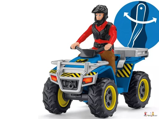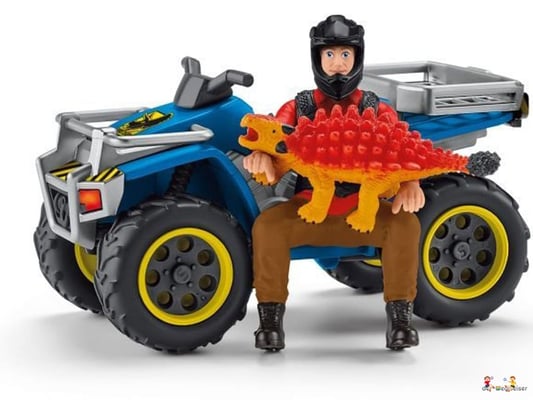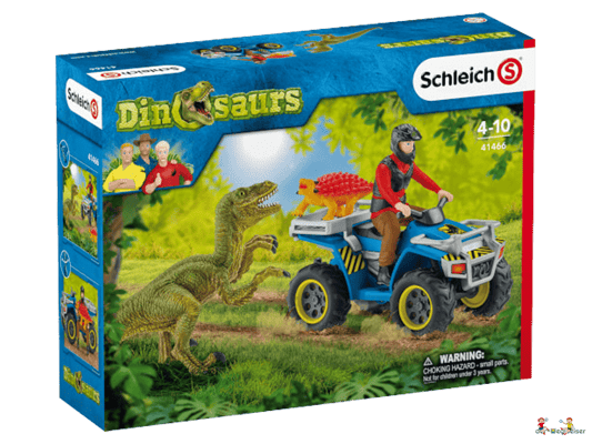 Ein gefährlicher Velociraptor lauert im Gebüsch und attackiert den kleinen Ankylosaurus Kylo. Zum Glück ist Flynn auf seinem Quad schnell zur Stelle und kann ihn retten. Das Set Flucht auf Quad vor Velociraptor von Schleich Dinosaurs bietet viele Möglichkeiten für rasanten Spielspass!