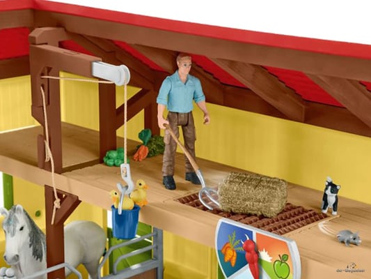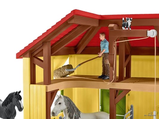 Während sich die Bäuerin für einen spannenden Ausritt bereit macht, sorgt Bauer Paul dafür, dass alle Tiere versorgt sind: Mit dem beweglichen Flaschenzug transportiert er Futter auf den Heuboden. Dank der beweglichen Transportrollen gelangen die Heuballen ganz leicht zur Futterrutsche, von wo sie rasant in die Schubkarre sausen. Die integrierte Fütterungsanzeige zeigt Schritt für Schritt, was die Tiere als Nächstes bekommen – so wird spielerisch Verantwortung übernommen.
