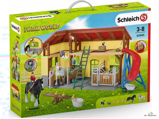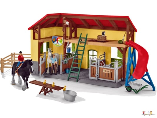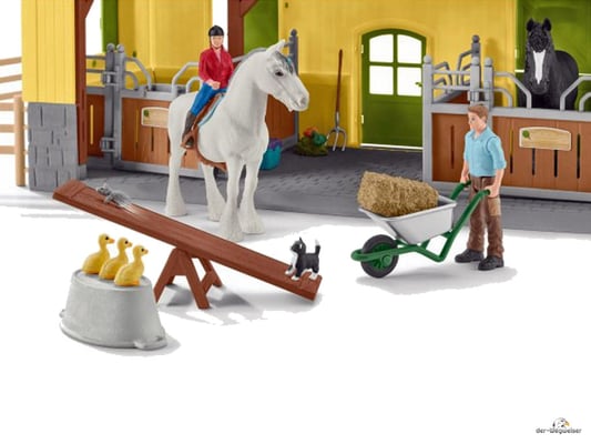 Der Ssale neue bunte Schleich Pferdestall bietet viele tolle Spielfunktionen und sorgt bei den Kleinen für langanhaltenden Spielspass! Mit seinen 7 s20 süssen Tieren, 2 Pferdeboxen, Bauer Paul, Bäuerin Laura und jeder Menge liebevoll gestaltetem Zubehör lässt sich das tägliche Leben auf dem Hof ganz einfach nachspielen.